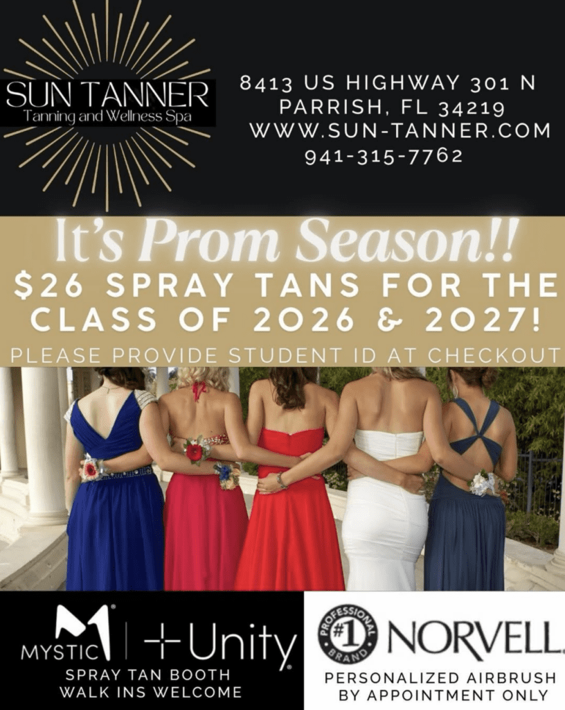 At Sun Tanner in Parrish, we’re offering $26 spray tans for the Class of 2026 & 2027—an easy way to get an even, natural-looking tan before prom.